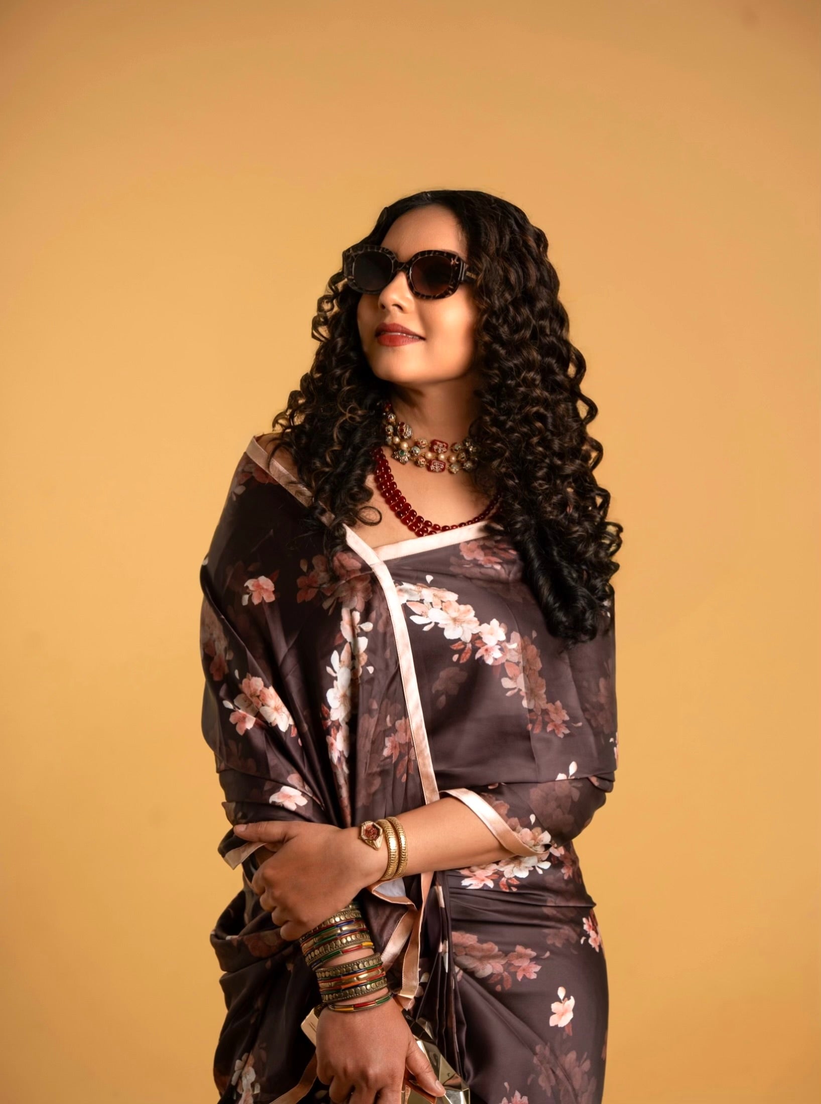 Dark Brown And Peach Floral Pattern with Peach Border READY TO WEAR Satin Saree