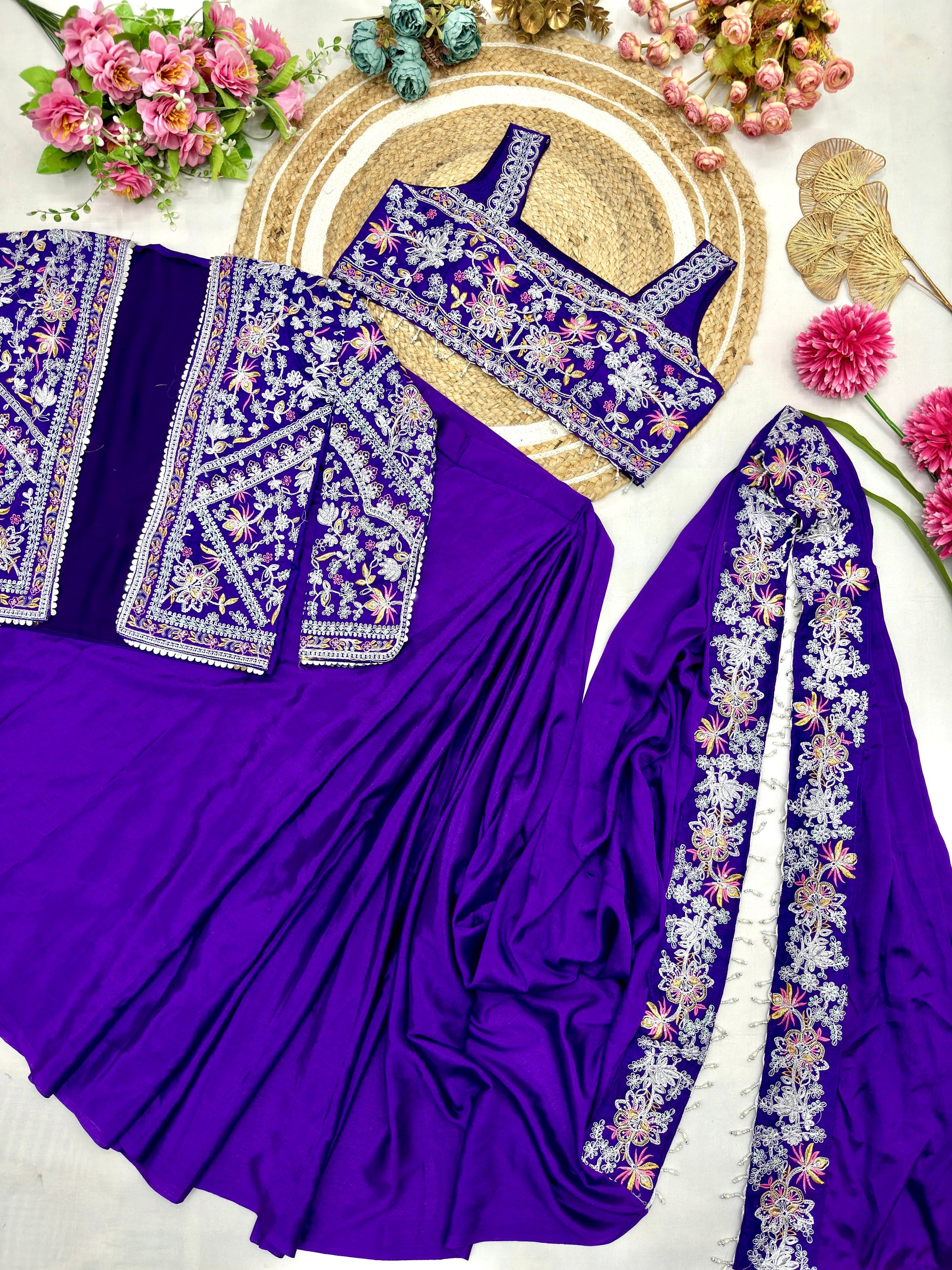 Turn heads with this bold and glamorous designer saree ensemble, featuring exquisite thread embroidery across the drape, blouse, and matching jacket. The three-piece fusion set blends traditional elegance with a contemporary twist—perfect for weddings, festive occasions, and fashion-forward celebrations.