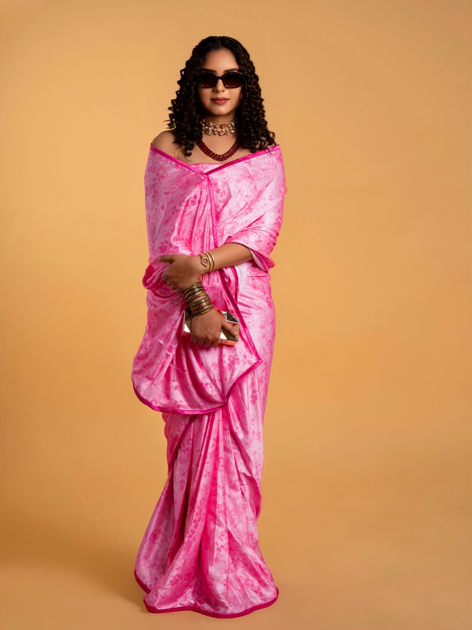 Light Pink Floral Pattern with Dark Pink Border READY TO WEAR Satin Saree
