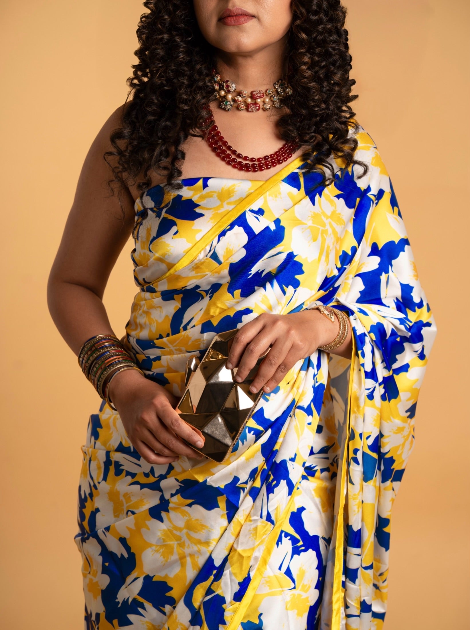 White And Blue Floral Pattern with Yellow Border READY TO WEAR Satin Saree
